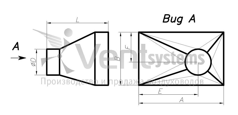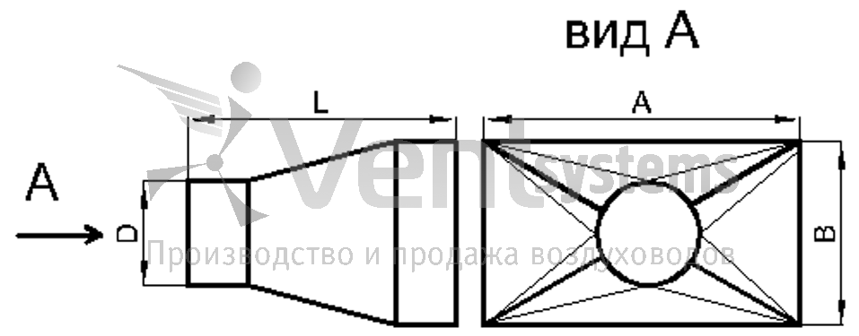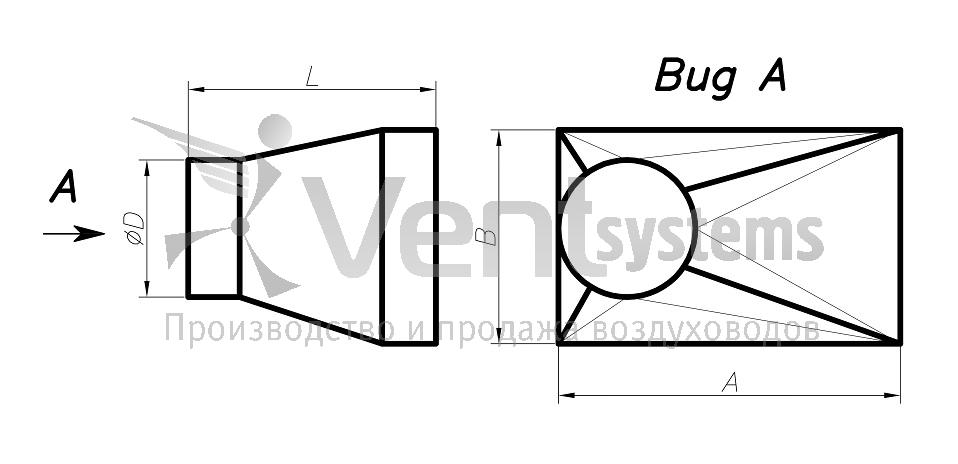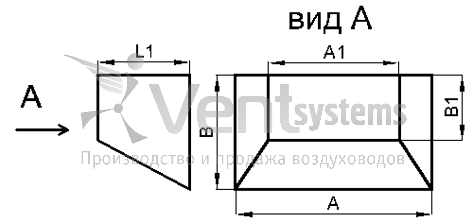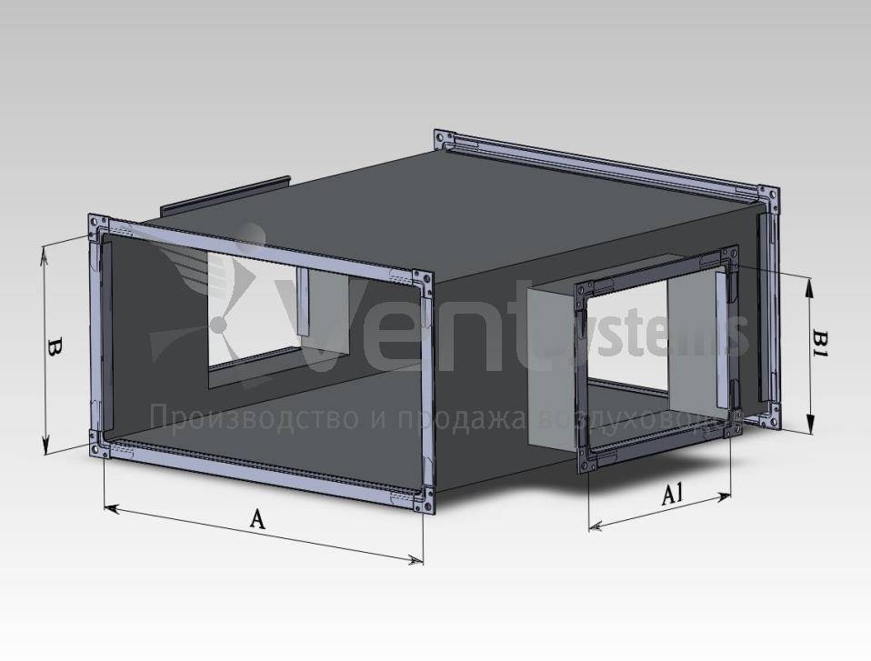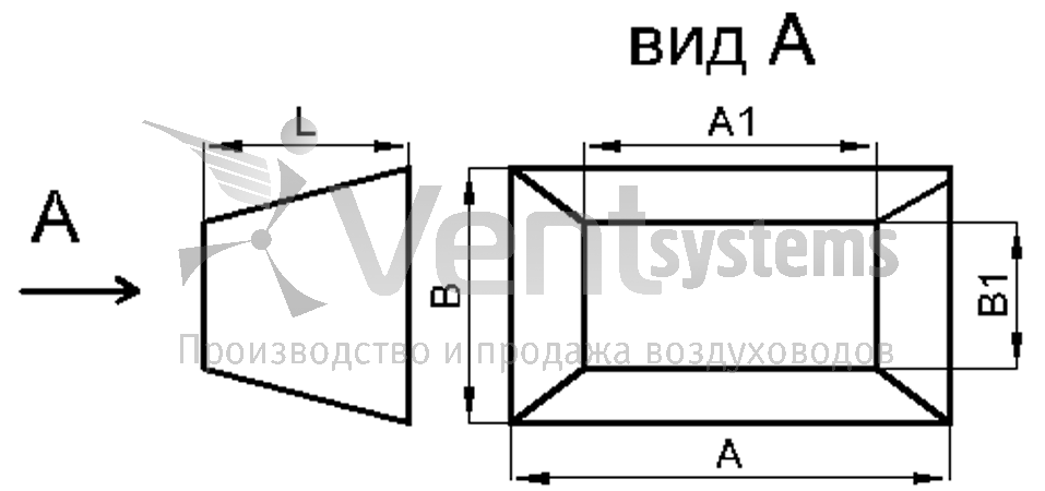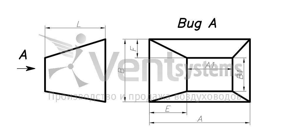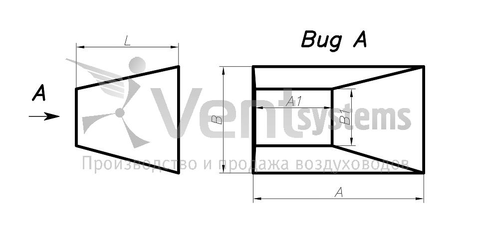 Прямоугольный стальной оцинкованный переход с фланцами (длина перехода подбирается автоматически, исходя из рекомендованных параметров)